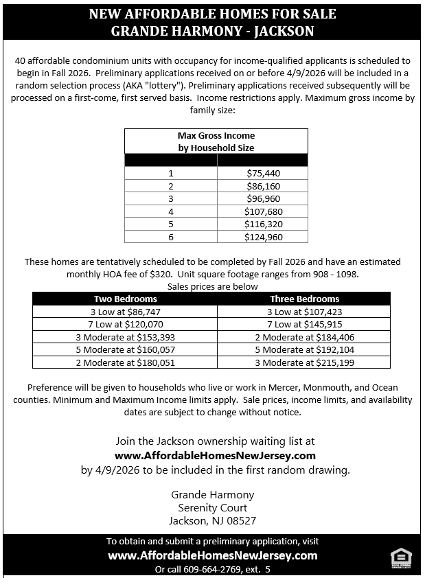 Join the Jackson ownership waiting list at www.AffordableHomesNewJersey.com by 4/9/2026 to be included in the first random drawing. If you do not have an email address, call 609-664-2769 ext. 5.
